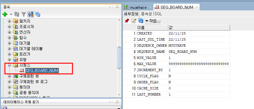 <생성된 시퀀스 정보보기>