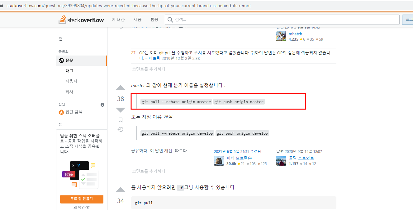 그니까앞으로 : push하기 전 & 작업하기 전에 git pull 명령어를 통해서 원격저장소의 최신상태를 유지한 상태에서 push를 해야함