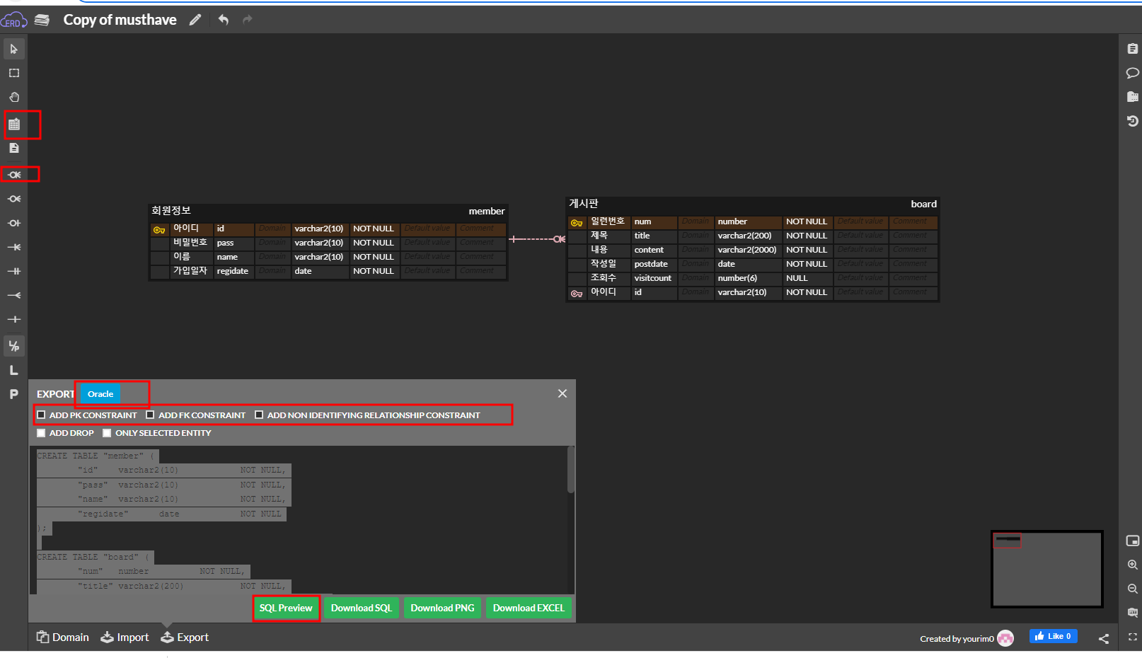 하단 export로 orcle 선택하면 쿼리문 생성된다.