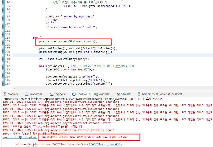 오류 : ORA-03115: 지원되지 않은 네트워크 데이터 유형 또는 표현이 있습니다