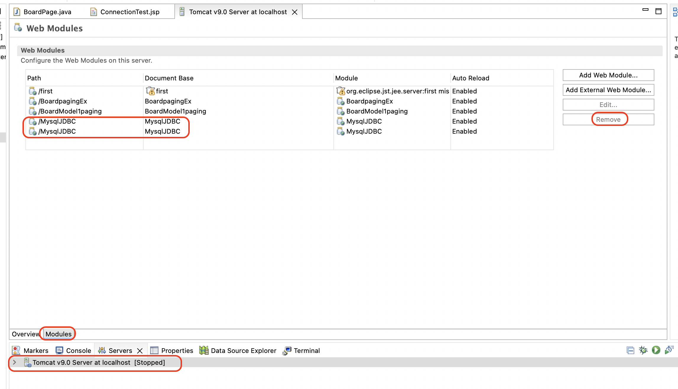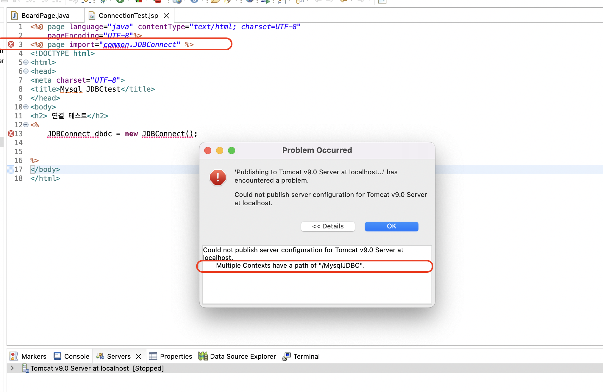 보면 서로 다른 프로젝트가 '/MysqlJDBC'이라는 같은 Path명으로 등록 되어있다