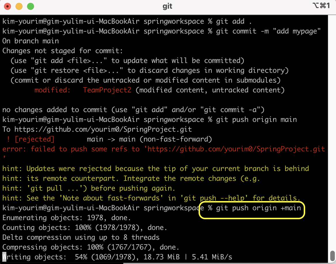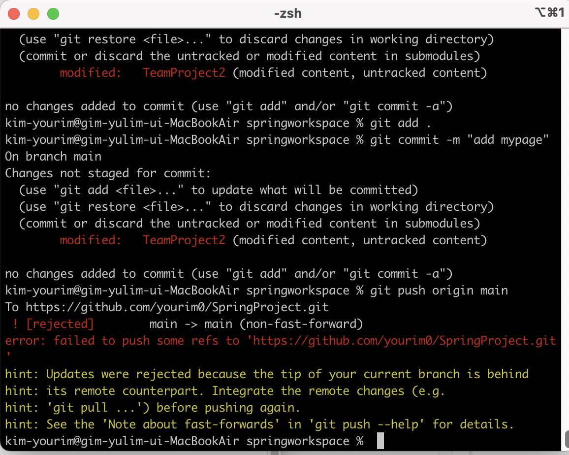 error: failed to push some refs to 'https://github.com/yourim0/SpringProject.git'