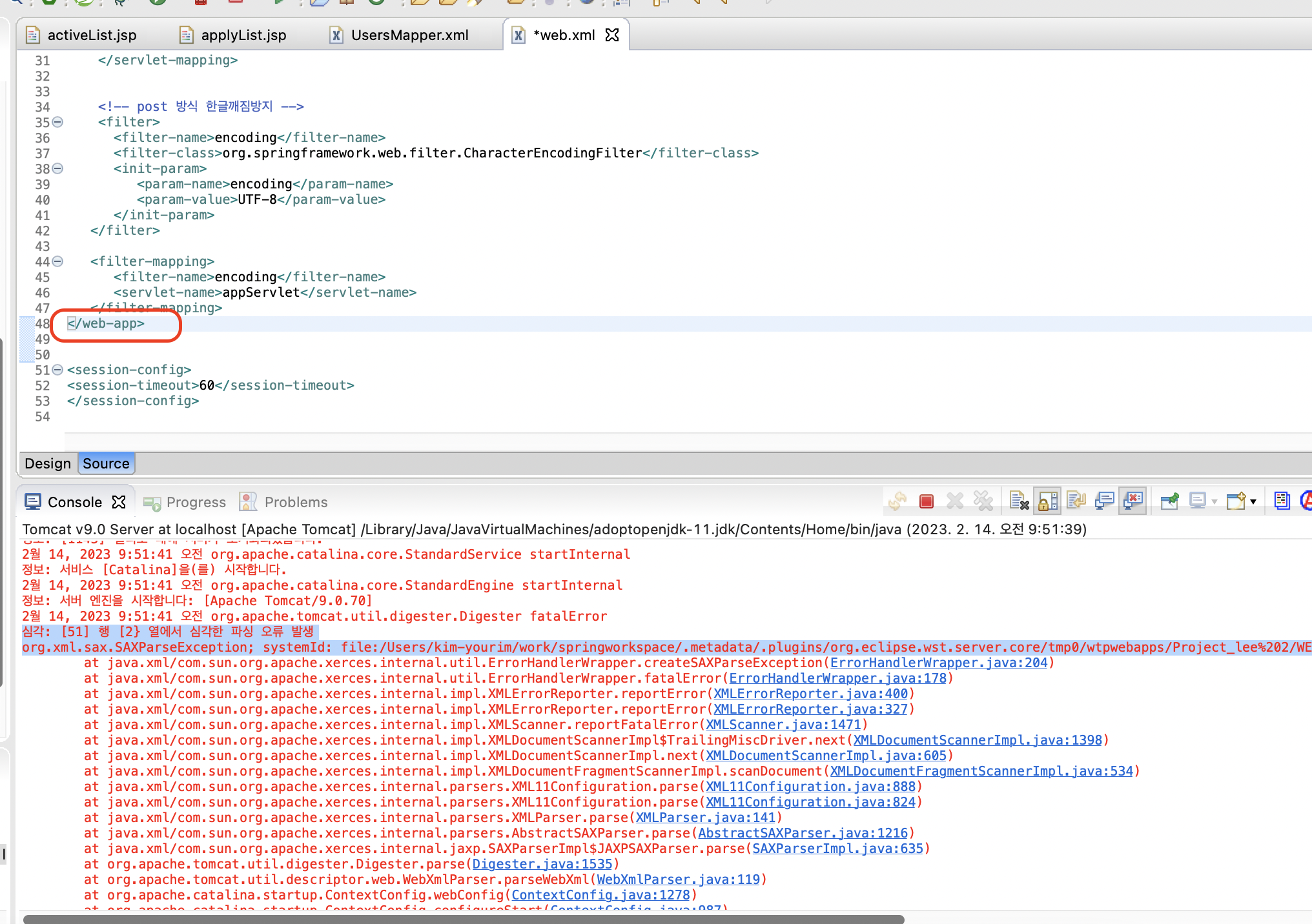 심각: [51] 행 [2} 열에서 심각한 파싱 오류 발생org.xml.sax.SAXParseException; systemId: file:/Users/kim-yourim/work/springworkspace/.metadata/.plugins/org.eclipse.wst.server.core/tmp0/wtpwebapps/Project_lee%202/WEB-INF/web.xml; lineNumber:..