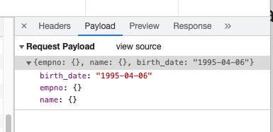 var param = {"empno":empno.value, "name":name.value, "birth_date":birthday}