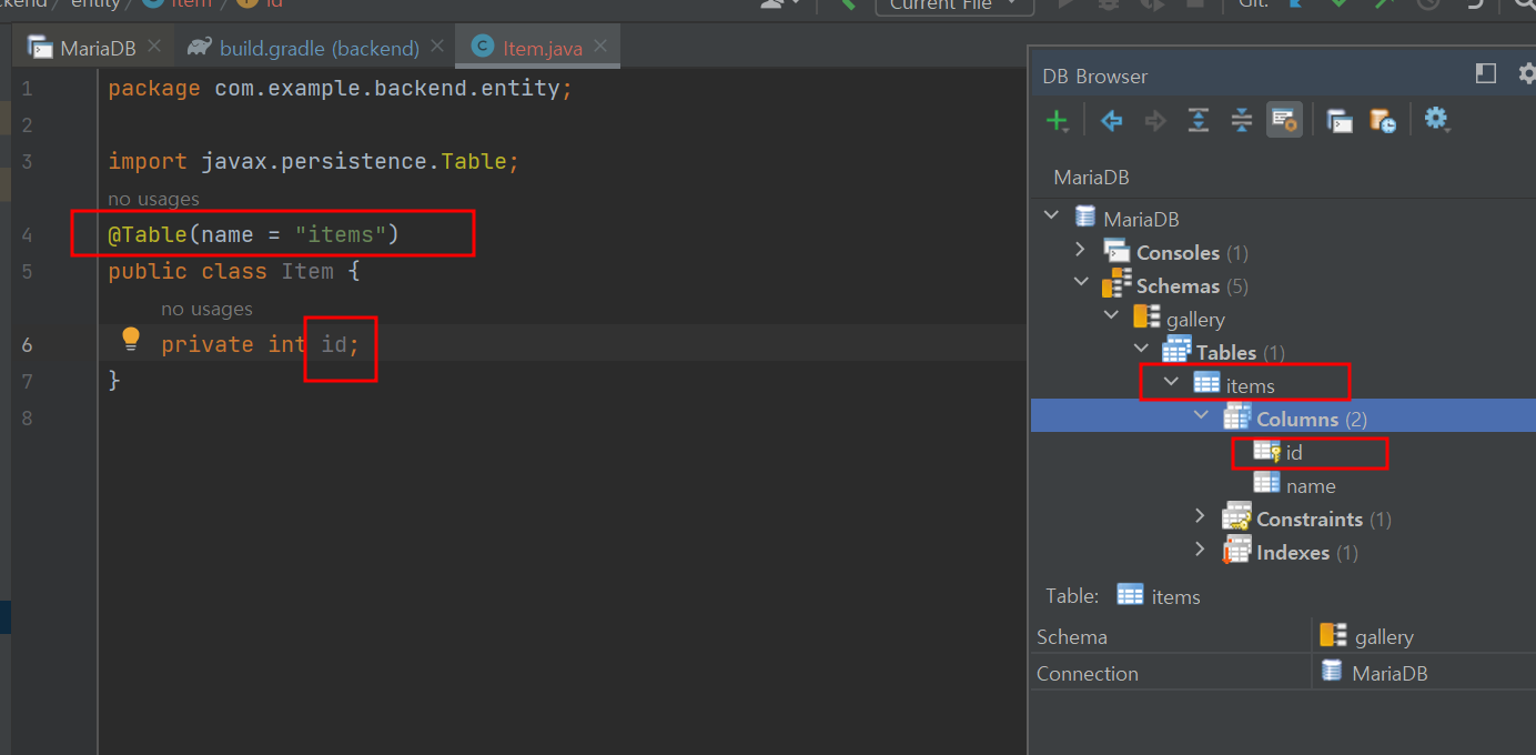 ex) items 테이블의 columns와 매핑