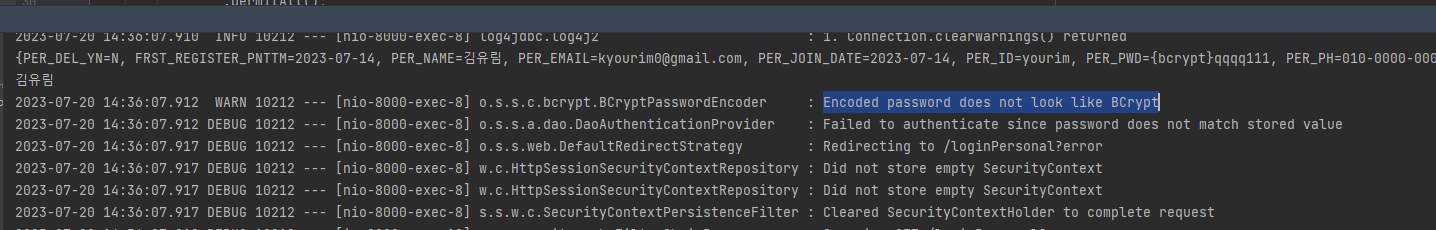 데이터베이스에 암호화 되어 있지 않은 임의로 넣은 pw 값이 있었다.