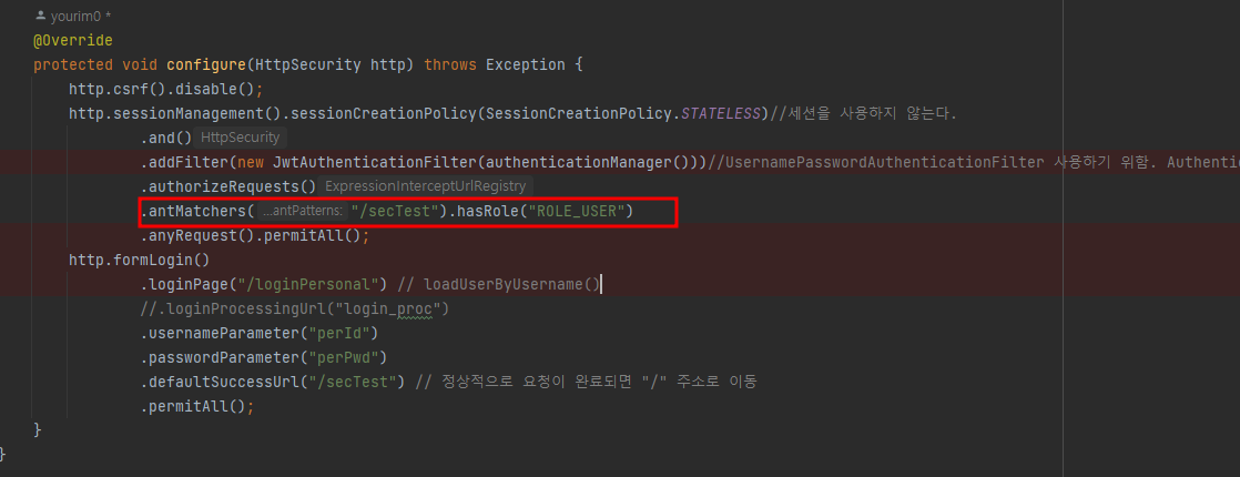 .antMatchers("/secTest").hasRole("USER") 로 수정한다.