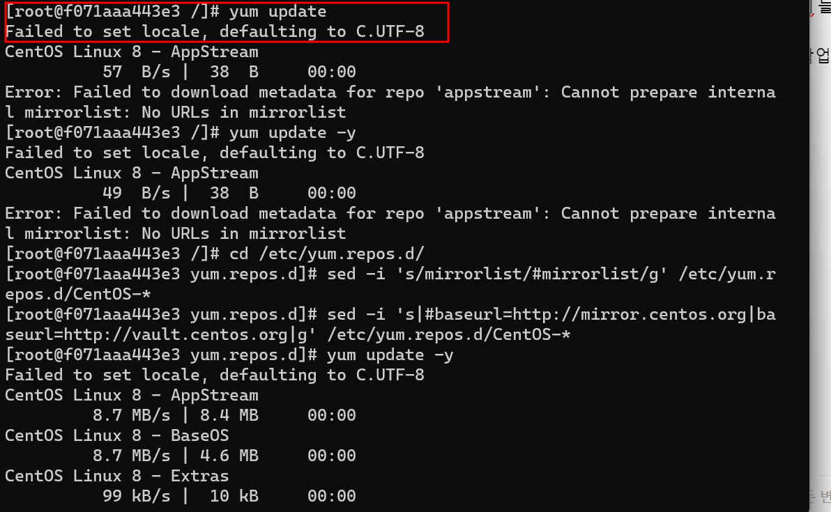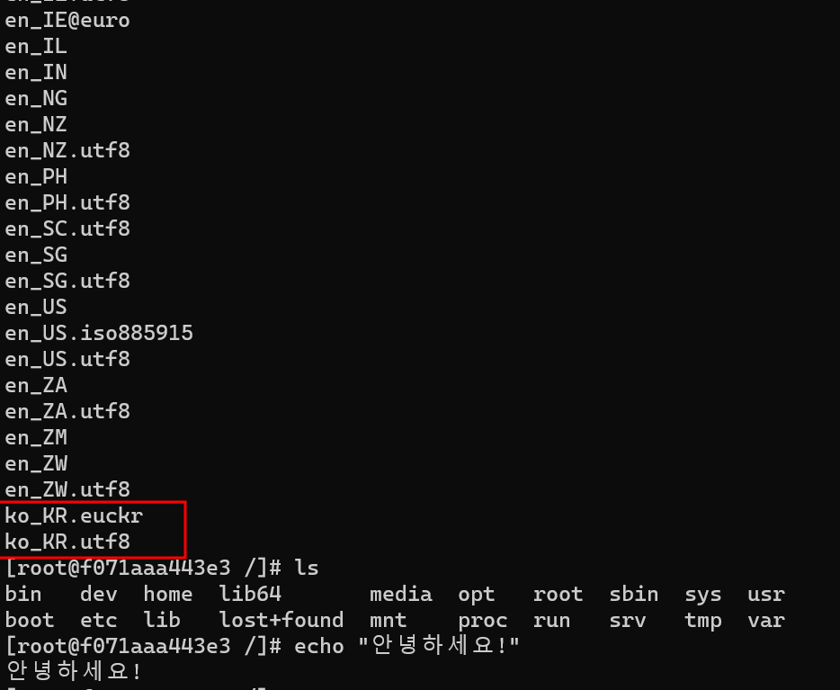 * 위 명령어 입력 후 "Failed to set locale, defaulting to C.UTF-8" 오류 발생 시 아래 세줄 입력.