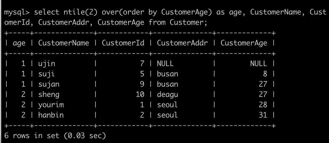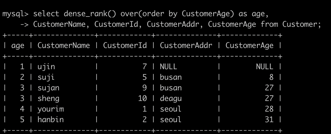 select row_number() over(partition by CustomerAddr order by CustomerAge desc) as you,