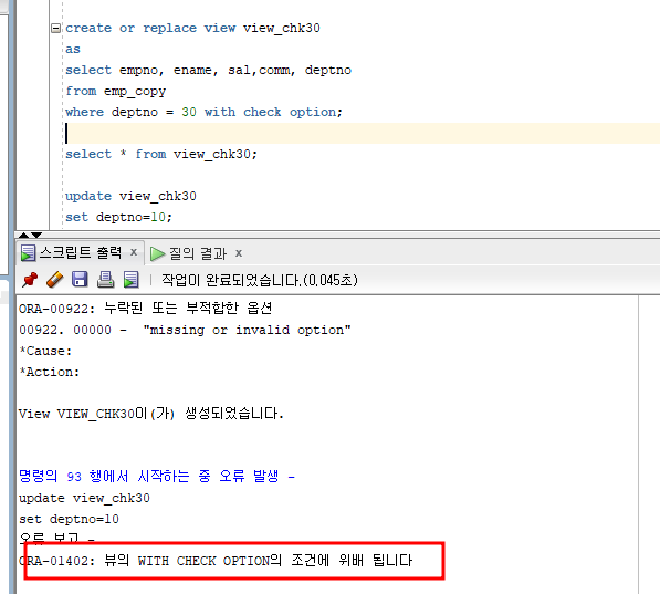 - with check option : 지정한 제약조건을 만족하는 데이터에 한해 DML 작업이 가능하도록 뷰 생성