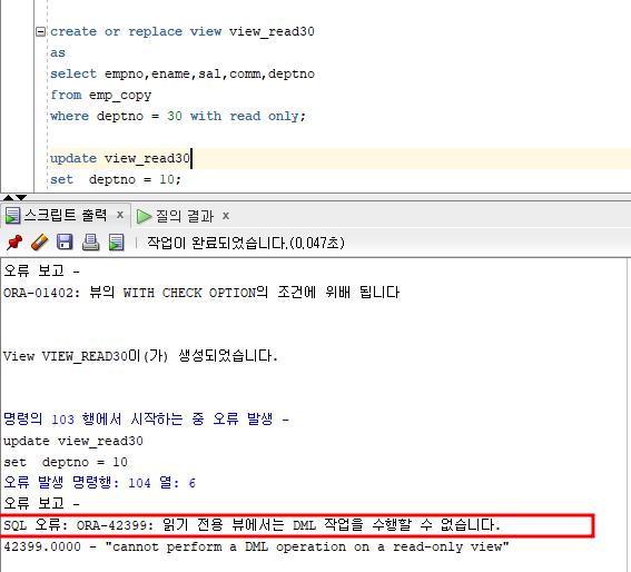 - with read only : 뷰의 열람(select)만 가능하도록 뷰 생성